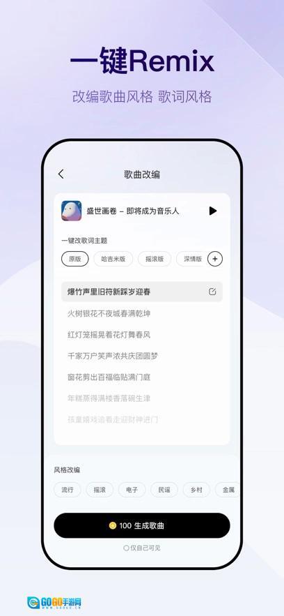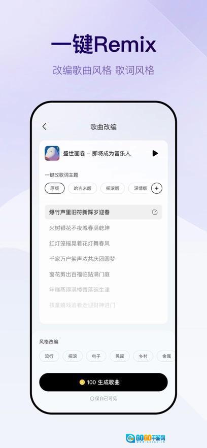 -由腾讯音乐打造,实现全流程一体化闭环模式,从词曲创作到编曲演唱可一键完成。
