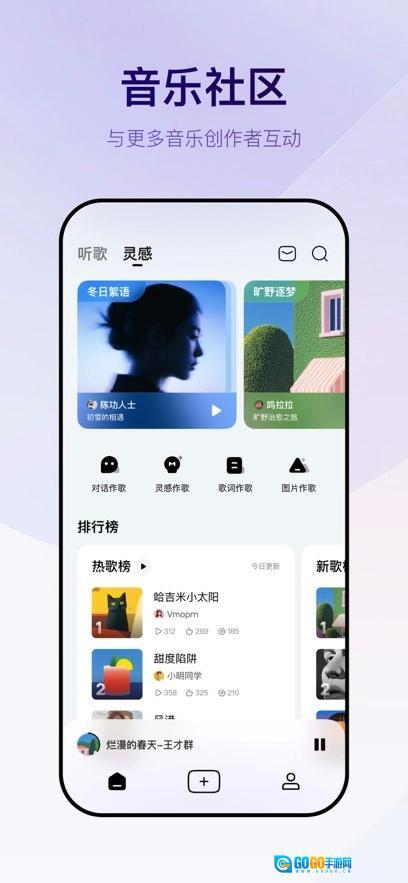 社交化社区:AI音乐社区,具备作品分享、热歌排行及互动功能。