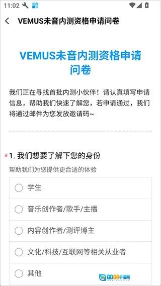 邀请码可通过在平台填写内测资格问卷获取,完成填写后就能开展AI音乐创作。