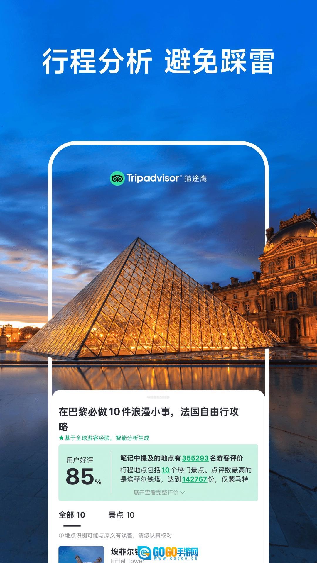 Tripadvisor猫途鹰是一款实用性很强的旅游信息服务平台,致力于为旅行者提供全球范围的旅行规划、预订与分享服务。作为旅游领域的“大众点评”,它整合了全球旅行者分享的各类旅游相关内容,覆盖酒店、景点、餐厅、航空公司等多个维度的信息,助力用户做出更合理的出行决策。
