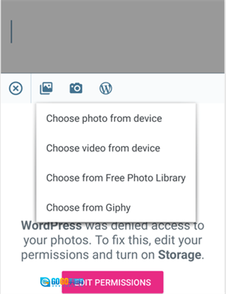 3、单击“添加”按钮将图像添加到您的博客文章中。该应用程序允许您使用手机的相机或WordPress媒体库上传设备中的图像