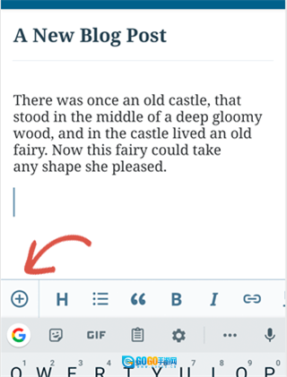 2、可以编辑任何博客文章或点击添加新按钮来创建新的博客文章。这将启动WordPress应用程序的内容编辑器。在这里,您可以使用手机的原生键盘写一个新帖子,底部有一个格式工具栏