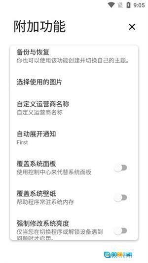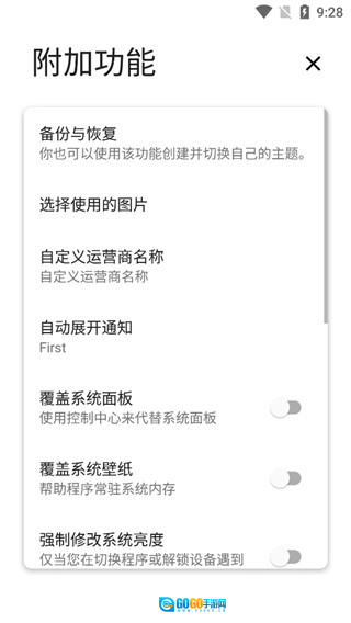 5、在附加功能板块里,用户能够自主设置是否开启覆盖系统面板、覆盖系统壁纸以及保持自动亮度这些功能。