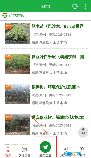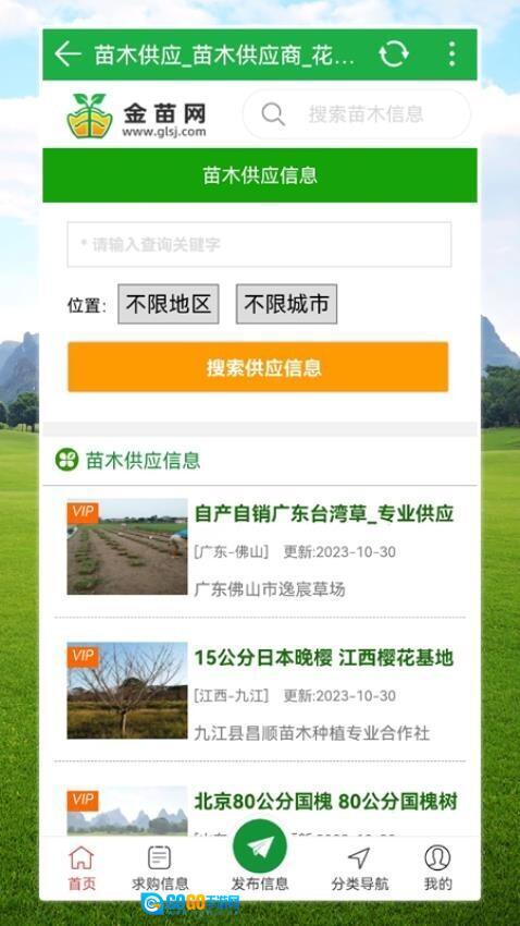 2、点击供求信息板块,即可浏览最新苗木资讯,还能按地区分类筛选目标内容。