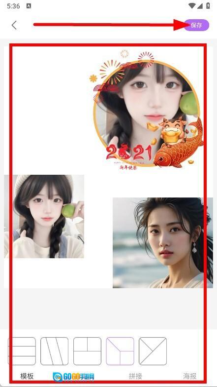 4、挑选模板、自由拼接、海报拼接等方式,完成拼图的相关设置后,点击右上角的保存按钮。