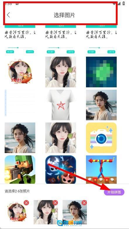 3、进入图片选择页面后,选取2到6张待拼接的图片,然后点击开始拼图按钮。
