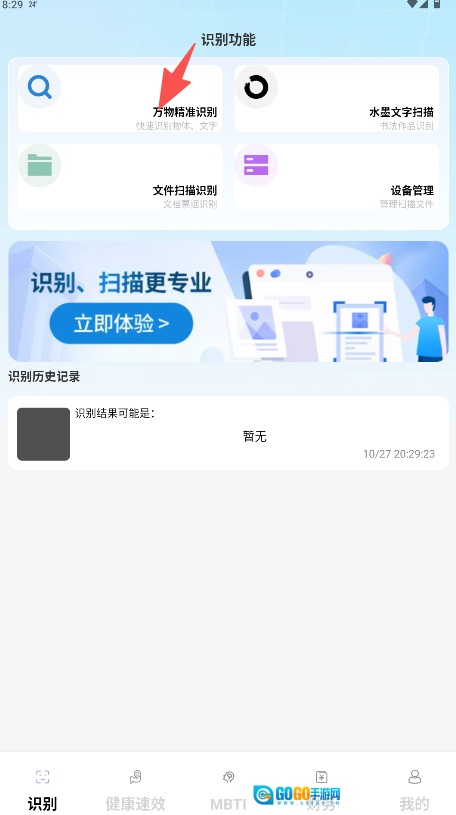 1、在软件首页的“识别功能”板块中,点击“万物精准识别”选项,即可进入多功能识别界面。