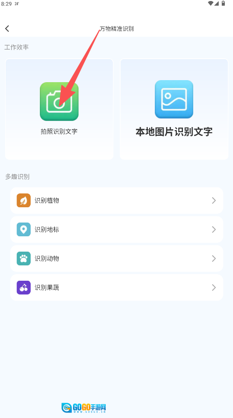 2、在“万物精准识别”页面的栏目中选择“拍照识别文字”功能,准备拍摄待识别物体。