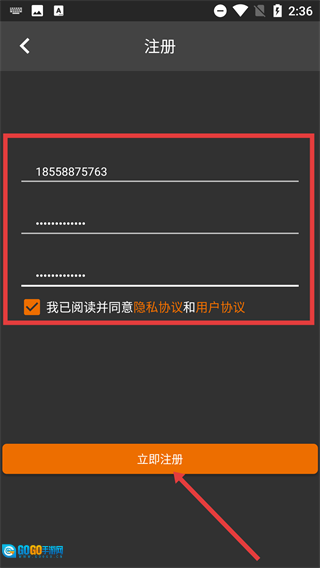 4、进入注册页面后,依次填写手机号与密码,勾选同意相关协议,随后点击【立即注册】按钮,即可完成账号注册流程。