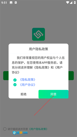 2、阅读《用户隐私政策》,勾选同意《隐私政策》和《用户协议》后,点击“同意”按钮,即可继续使用应用服务。