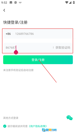 4、在【快捷登录/注册】页面输入手机号,获取并填写【验证码】后点击【登录/注册】按钮,若该手机号未注册过,系统将自动完成注册流程。