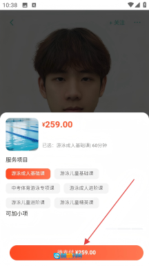 4、进入服务项目选择页面,选定所需项目后,点击【待支付】按钮,即可完成教练预约的支付流程。