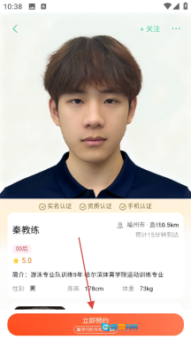 3、进入教练详情页面后,点击【立即预约】按钮,即可跳转至服务项目选择页面。