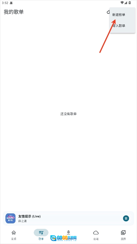 4、进入“歌单”页面,点击“新建歌单”按钮,输入歌单名称后,把喜欢的歌曲添加到自己创建的歌单里,以此对音乐进行分类管理。