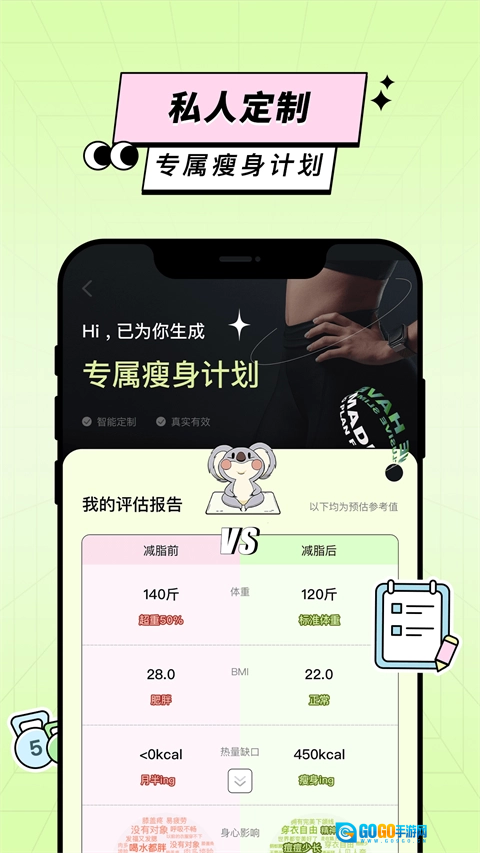 1.定制专属个人方案:依据用户的身体状况与减肥目标,量身打造个性化的健身规划及饮食指导。