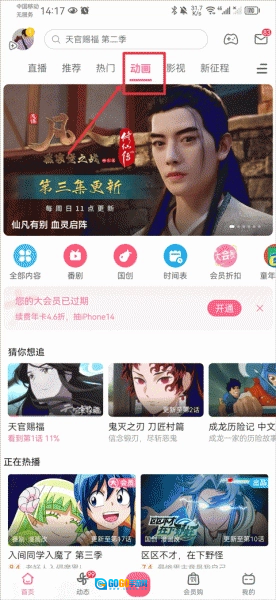 1、打开哔哩哔哩动漫最新版后,在首页中点击动画界面,并选择你要观看的动画