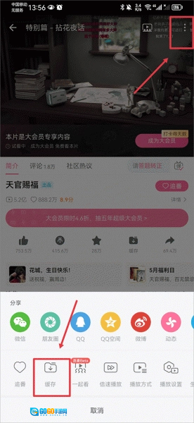 2、在动画观看界面中点击右上角三点后,在点击下方缓存按键