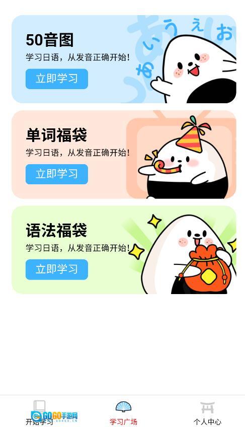 2、进入学习广场可选择基础模块,包括50音图练习、单词闯关等趣味学习内容。