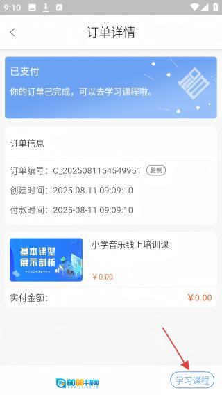 4、订单支付完成后,在订单详情页点击【学习课程】开始学习。