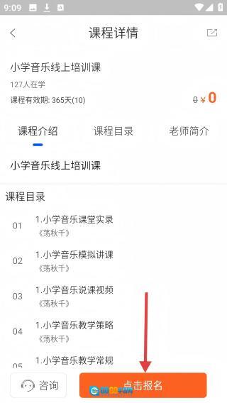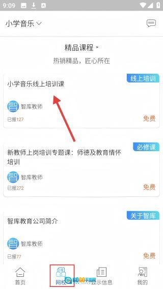 1、进入【网校】页面,点击【小学音乐线上培训课】进入课程详情页。