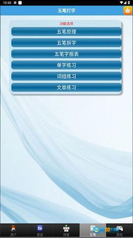 4、点击屏幕下方的五笔,可以访问五笔打字练习区域,包含拼音、单字、词组、文章练习,还提供五笔原理、拆字方法和字根表等学习资料。