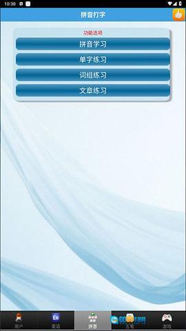 3、点击屏幕下方的拼音,进入拼音打字练习界面,可以进行拼音、单字、词组以及文章等多层次练习。