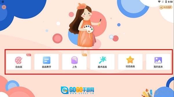 一、打开画图软件后,界面上呈现出六个基础功能模块,分别为自由画、画画教学、上色、魔术画画、动态画画和我的画本。其中,【上色】模块具备为图片快速填充色彩的功能,用户自行创作的所有图画则会统一存储在【我的画】当中。
