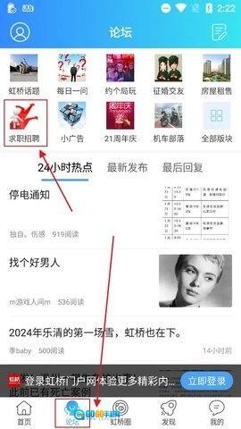 2、在首页找到并点击【论坛】板块,进入后在功能栏中点击【求职招聘】选项;