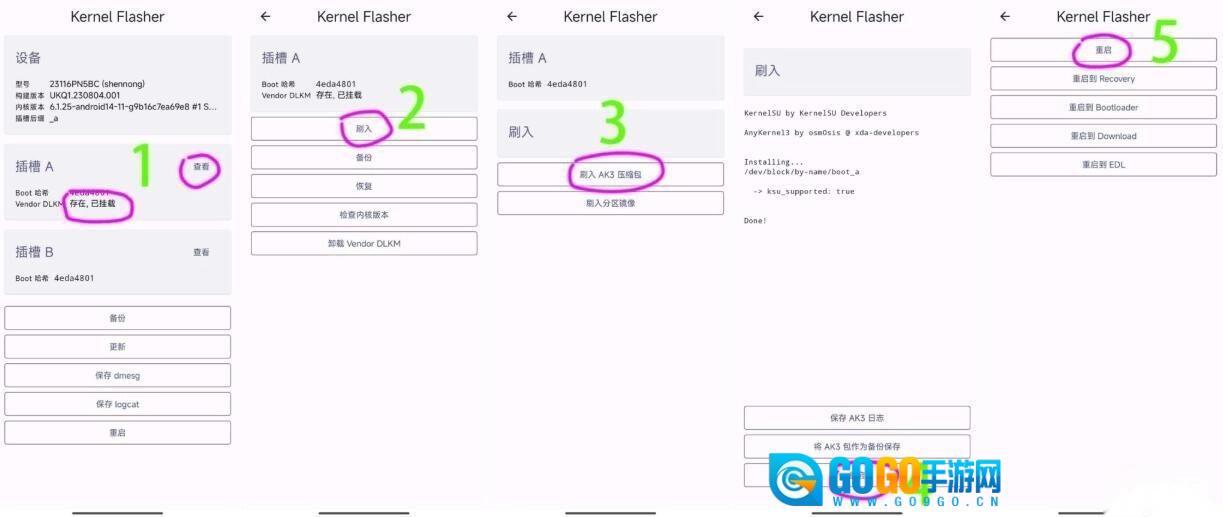查看已挂载的插槽,依次执行刷入操作:先刷入AK3压缩包,待显示刷入成功(重启)后,重启设备即可完成刷入。