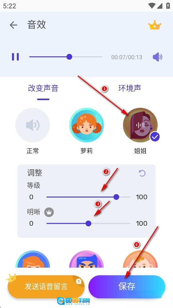 挑选你希望转换的声音类型,像御姐音这类,还能对声音参数做些微调,等调整到满意的效果后,点击界面上的【保存】按钮就可以了。