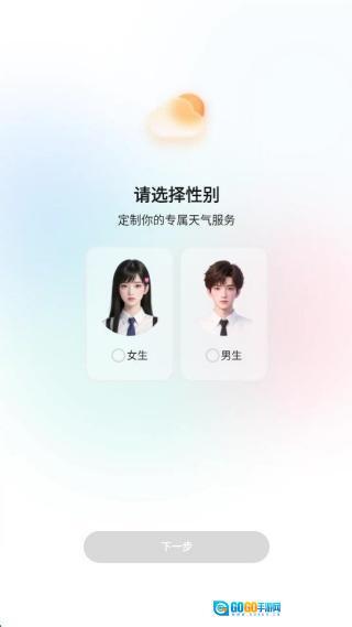 1、完成安装并进入应用后,先选择你的性别,系统会据此推荐适配不同天气的查询背景。
