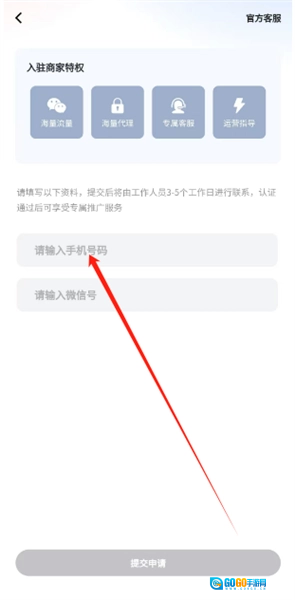 2.在入驻页面,用户可查看商家特权,输入手机号与微信号后等待审核即可。