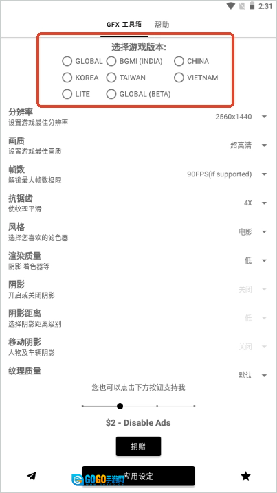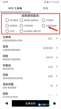 1、打开gfx工具箱,进入应用主界面,首先选择需要修改的游戏版本,包括国服、越南服、印度服、韩服和台服等八个游戏版本,这里以【越南服】为例,