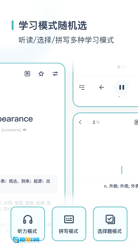 【单词拼写学习】拼单词拼写测试,强化词汇在脑海里的记忆。;支持拼写提示、熟知跳过、生词本和错题本,同步到学习页面,学习更高效。