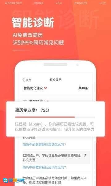 『智能优化建议,科学评分,制作满分简历』