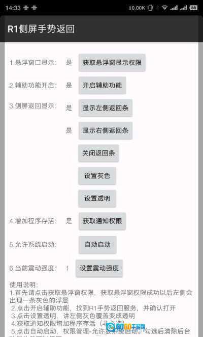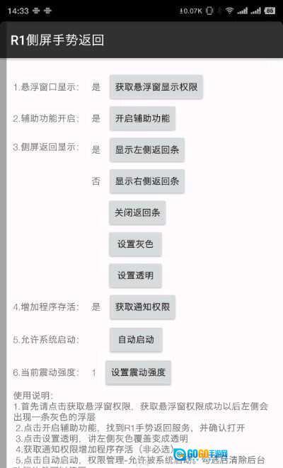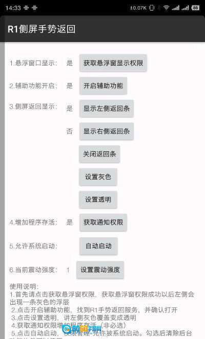 1.首先请点击获取悬浮窗权限,成功获取该权限后,左侧会出现一条灰色浮层。