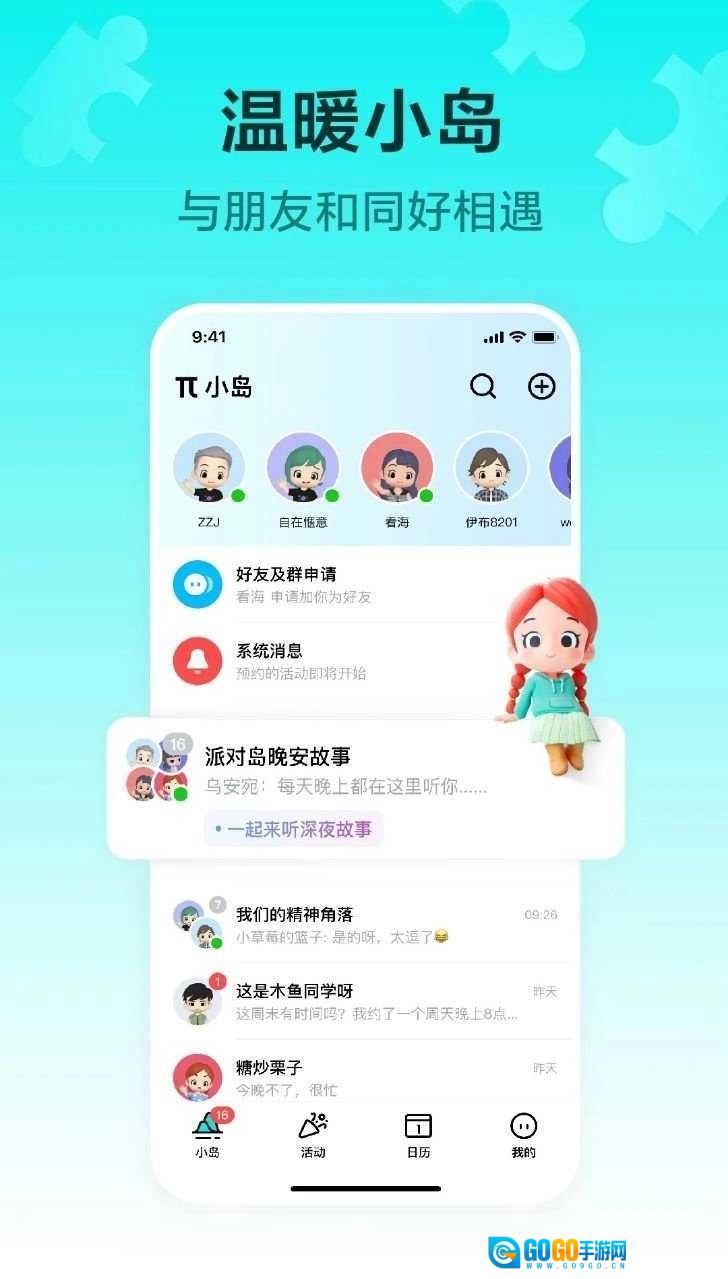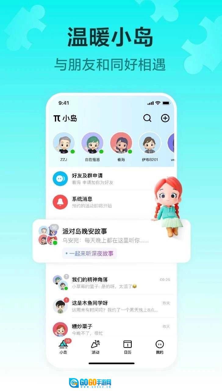 在ponytown派对岛里,底部导航栏设有四个选项,即小岛、活动、日历与我的。进入小岛页面,玩家能够查看好友申请、系统消息、联系人的在线状态以及其他玩家的聊天内容等,需要说明的是,ponytown派对岛具备创建群聊的功能。