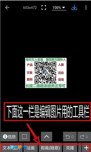 下面是编辑工具栏,其中常用的功能包括“文本/图片”“绘画”“剪裁”“克隆”,请先点击“绘画”按钮。
