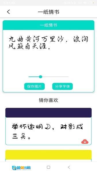 3、进入像【一纸情书】这样的具体字体详情页面后,你可以预览该字体的效果,同时还能保存字体预览图片或者分享这款字体。