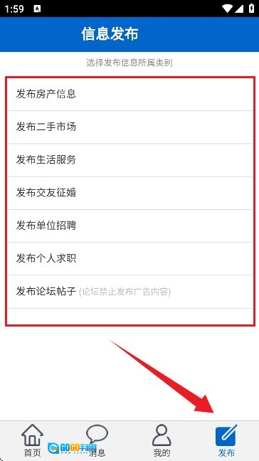 5、接着在【发布】板块也能发布各类信息帖子。就像图中展示的那样,涵盖房产、二手交易、生活服务、交友征婚、招聘求职等多种类型。