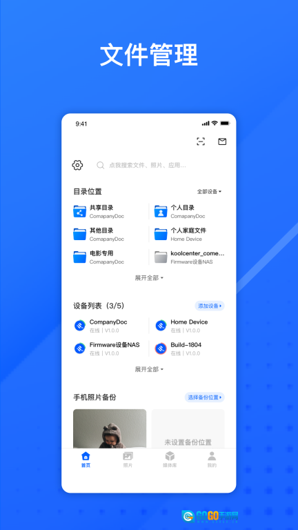3、进入首页后,可查看已绑定的设备列表,进而开展文件浏览、视频播放、照片备份等相关操作。