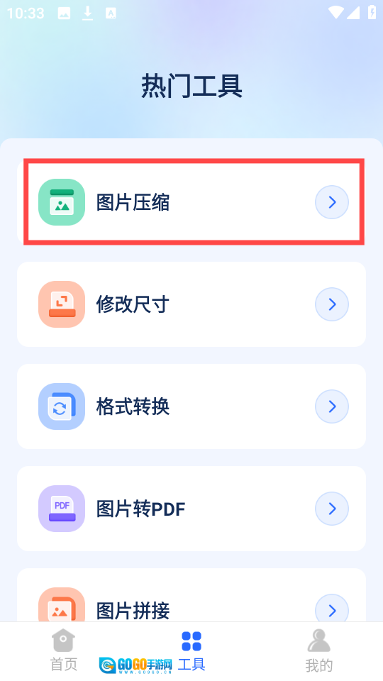 2、然后点击下方的“工具”选项,从中找到“图片压缩”功能,具体操作可参照图示。