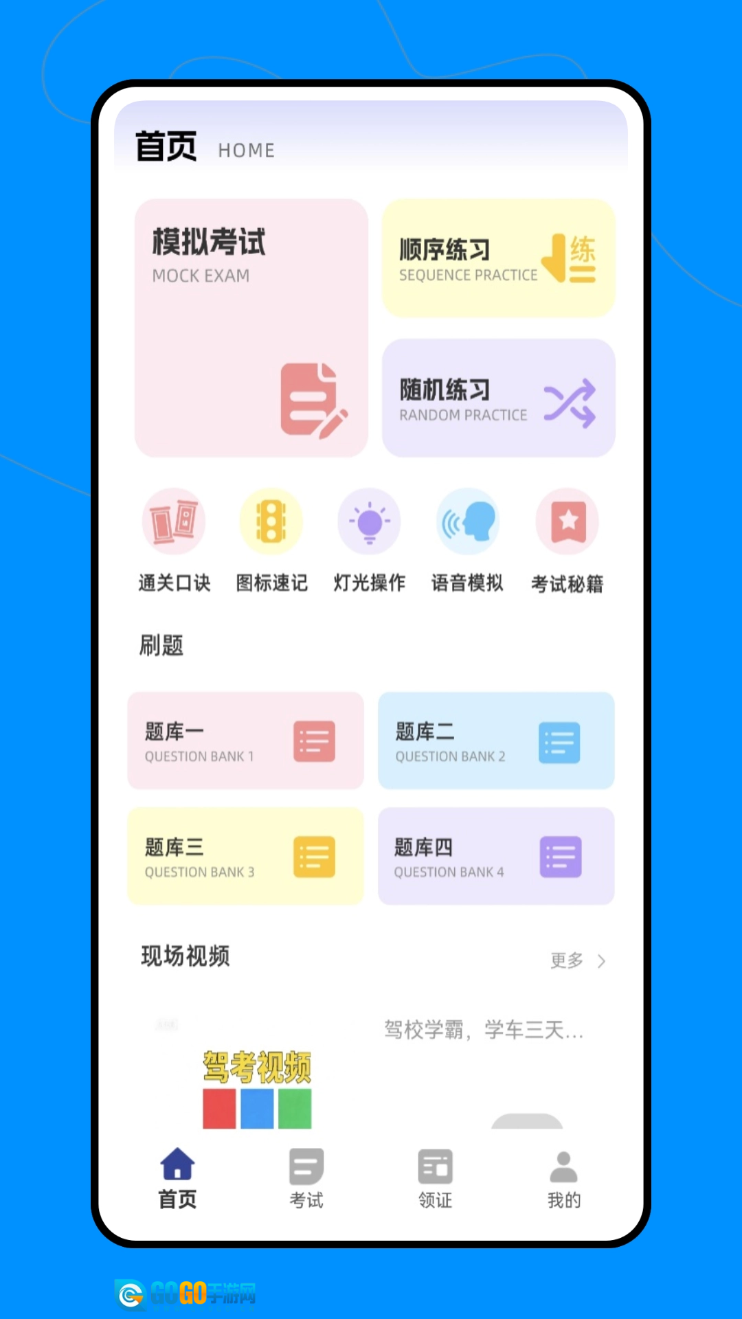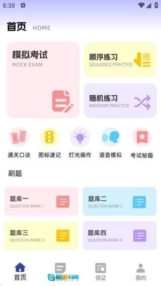 1、包含模拟考试、顺序练习、随机练习三种刷题模式,还有四大题库可供选择。