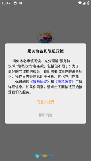 1、先安装该软件,安装完成后将其打开,在弹出的页面中点击“同意并接受”相关按钮,随后进入软件的登录界面;