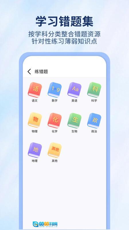 1、只需一键拍摄,就能精准识别错题,系统会自动对这些错题进行归类整理,并生成专属的错题本,便于学生随时回顾复习,从而精准定位自己的知识漏洞。