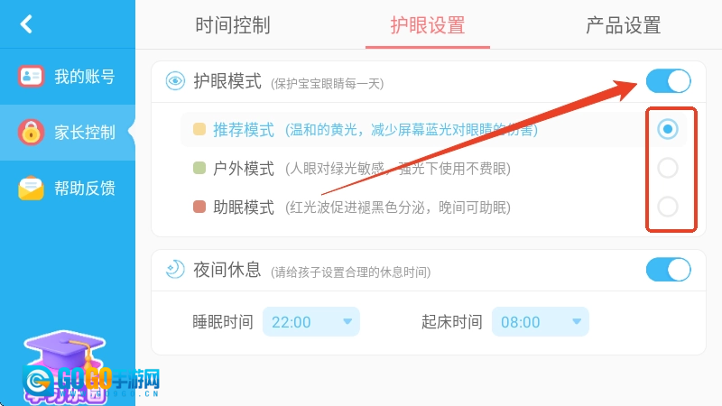 2、接着点击上方的【护眼模式】选项,开启护眼模式后,还能在下方挑选其他模式。