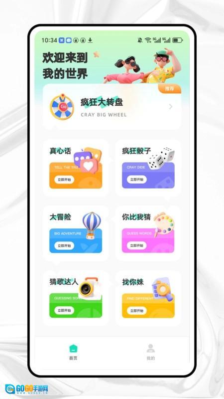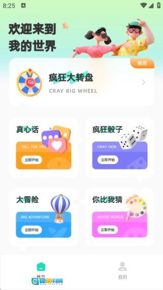 首页包含疯狂大转盘、真心话、疯狂骰子、大冒险和你比我猜这些互动功能。