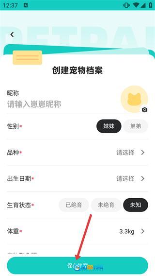 4、进入【创建宠物档案】页面后,依次填写【昵称】【性别】【品种】等必填项信息,随后点击【保存档案】按钮,即可完成宠物档案的创建操作。