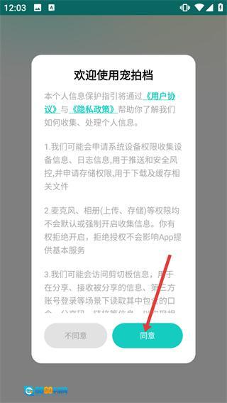 1、打开【宠拍档】应用后,先仔细阅读【个人信息保护指引】以及【用户协议】中的【隐私政策】内容,确认无误后点击【同意】按钮,就能进入应用使用各项相关功能了。