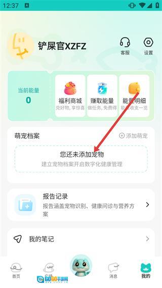 在【宠拍档】的首页,你可以使用【疾病咨询】【品种识别】等功能,点击底部的【我的】选项就能进入个人中心页面。